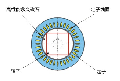 永磁电机 (IPM) 定子线圈交流电产生的旋转磁场,带动磁石转子转动。