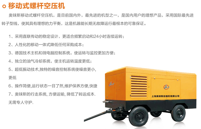 电移式螺杆空压机、柴移式螺杆空压机 奥铼斯移动式螺杆空压机,是目前国内外,先进的机型之一,是国内用户的理想产品,圆柱螺杆与两个星轮对称配置,使其具有理想的力平衡,因此其轴向力和径向力都能相互抵消,这是机器能长期无故障运行根本的可靠保证。 • 采用直联传动的稳定设计,更适合频繁启动和24小时连续运转;• 人性化的移动一体式降低任何采购成本; • 德国技术主机和微电脑控制系统,使压缩机的运转与监控更加方便; • 独立的油气冷却系统,使主机运转温度更低; • 内置式油分的设计,使主机的寿命更长,维护费用更低! • 根据不同功率精心搭配名牌动力,达到性能佳组合 • 效高化 • 超低振动技术,独特的噪音控制系统使噪音更小,更低 • 操作简便,运行状态一目了然,维护保养方便,快捷 • 采用高效率名牌电机, 实现效率大化. 大的操作灵活性,即使狭窄的施工现场也能进出自如. • 奥铼斯的行走系统, 方便运输, 降低了转运成本. • 整机智能化控制, 精心搭配世界名牌电器元件和德国MANN产品, 确保机组安全,稳定运行, • 无需专人守护.