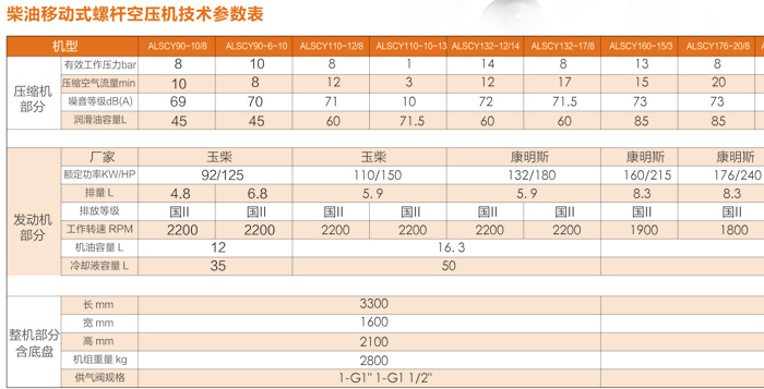 电移式螺杆空压机、柴移式螺杆空压机 奥铼斯移动式螺杆空压机,是目前国内外,先进的机型之一,是国内用户的理想产品,圆柱螺杆与两个星轮对称配置,使其具有理想的力平衡,因此其轴向力和径向力都能相互抵消,这是机器能长期无故障运行根本的可靠保证。 • 采用直联传动的稳定设计,更适合频繁启动和24小时连续运转;• 人性化的移动一体式降低任何采购成本; • 德国技术主机和微电脑控制系统,使压缩机的运转与监控更加方便; • 独立的油气冷却系统,使主机运转温度更低; • 内置式油分的设计,使主机的寿命更长,维护费用更低! • 根据不同功率精心搭配名牌动力,达到性能佳组合 • 效率高化 • 超低振动技术,独特的噪音控制系统使噪音更小,更低 • 操作简便,运行状态一目了然,维护保养方便,快捷 • 采用高效率名牌电机, 实现效率大化. 大的操作灵活性,即使狭窄的施工现场也能进出自如. • 奥铼斯的行走系统, 方便运输, 降低了转运成本. • 整机智能化控制, 精心搭配世界名牌电器元件和德国MANN产品, 确保机组安全,稳定运行, • 无需专人守护.