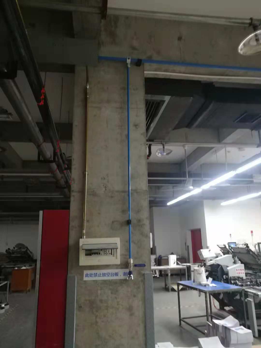 某印刷厂车间铝合金道安装 说明:该公司车间管道改造;之前用的是镀锌管,由于时间长了管道出现大量的锈,出来的气体不干净,影响生产;本次主要工作是车间全部采用铝合金安装;主管路用DN32,支管用DN20;